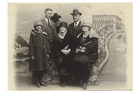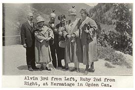 | Virgil Beesley, Ray R. Pratt, Pearl Graham Pratt (Morgan), Alvin Beesley, Ruby Pratt (Beesley), at San Francisco, 1928. From Carolyn Maxwell. | Alvin A. and Ruby Beesley with friends or family at the Hermitage in Ogden Canyon. From Carolyn Maxwell. |