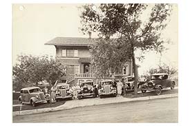 | Alvin A. and Ruby Pratt Beesley family with cars. Horace, Elrita, Marilyn, Mary, Ruby, Alvin, Theresa, Virgil, Louise, Bing, Paloma, Orson, Jackie, Sterling, 1934, at the Beesley home on 11th Ave. and G. Street in Salt Lake City. From Carolyn Maxwell. |